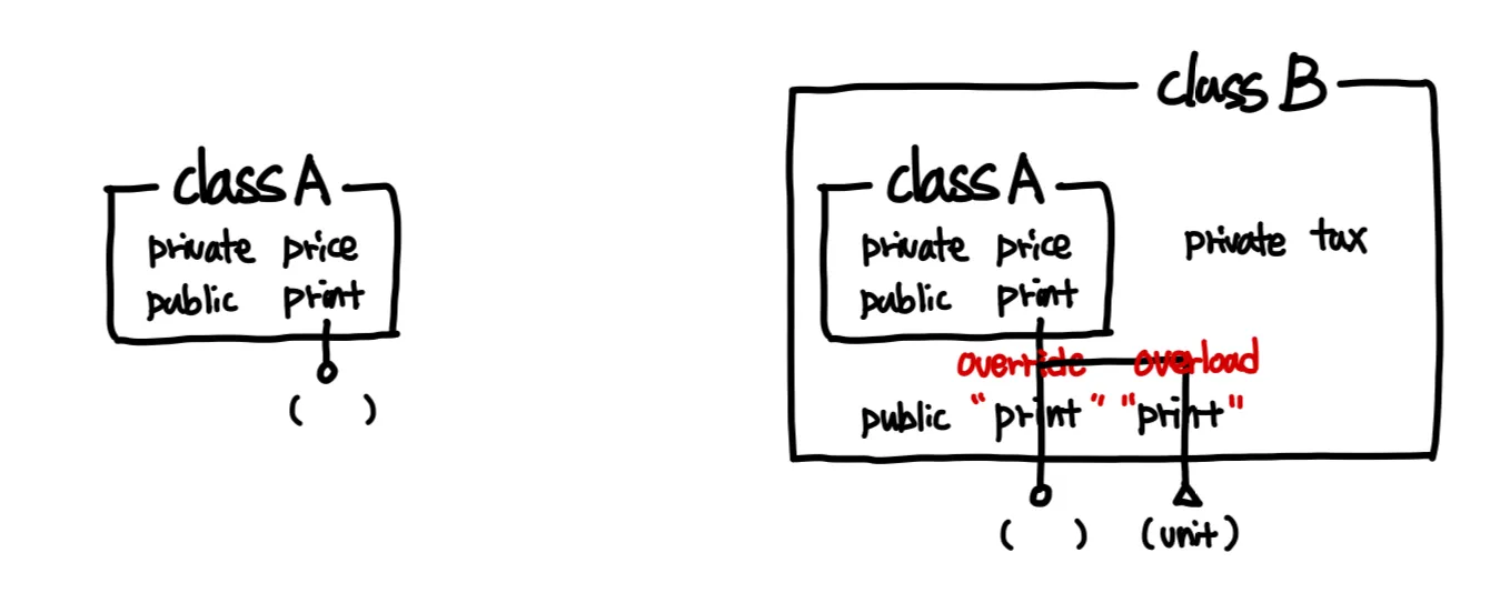 print()메서드를 외부로 노출하고 있다 (public)Class A객체는 Class A의 형상을 가지고, Class B객체도 Class A의 형상을 가지고 있기때문에 Class B 객체는 Class A 타입의 변수를 넣어서 Class A 처럼 사용이 가능해진다